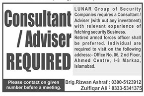 Below are the complete details of the Consultant jobs in Lunar Group Of Security in Islamabad .