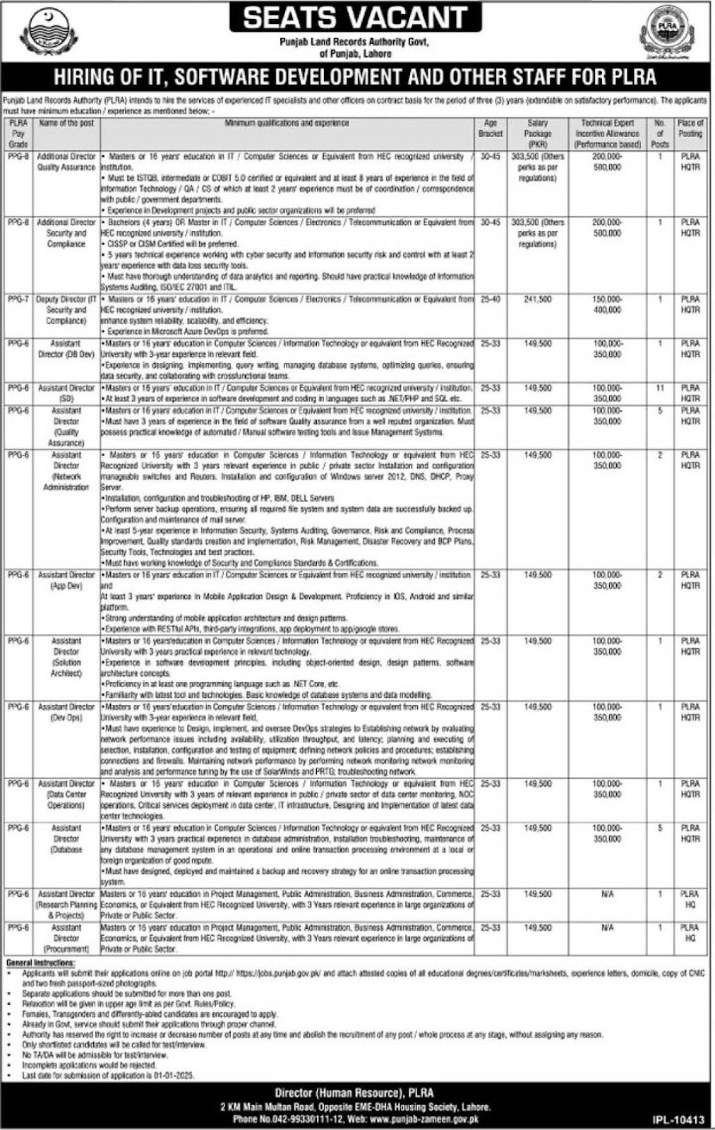 If you are looking for the Government job at Lahore, Punjab, Pakistan or in the vicinity of the Lahore, Punjab, Pakistan with the educational eligibility of Master | BCS | MCS | MBA | BIT | MIT | M.sc | MS | BS then you are lucky and on the right page because here we have shared the latest PLRA Punjab Land Records Authority Lahore Jobs 2025. The job has been posted on 06 December, 2024 and the last date to apply for the job is 01 January, 2025or as per paper ad. Do remember that this is a Full Time job.