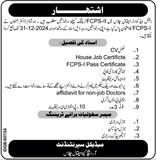 If you are looking for the internshipg job at Gilgit, Gilgit Baltistan, Pakistan or in the vicinity of the Gilgit, Gilgit Baltistan, Pakistan with the educational eligibility of MBBS | Others then you are lucky and on the right page because here we have shared the latest Regional Headquarter Hospital RHQ Chilas FCPS Training 2025. The job has been posted on 25 December, 2024 and the last date to apply for the job is 31 December, 2024or as per paper ad. Do remember that this is a Full Time job.